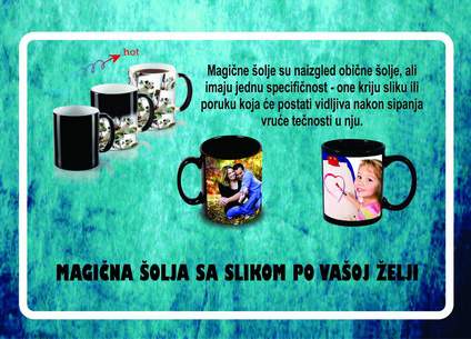 Šolje također mogu biti idealan poklon za Vašu dragu osobu, suvenir ili mjesto za Vašu reklamu. Učinite nekom svaki dan posebnim i svaku jutarnju kafu mnogo ljepšom uz naše šolje. Ukoliko želite nekoga posebno da iznenadite, učinite to sa Magičnom šoljom. Magična šolja jeste šolja koja dok je hladna ima izrazito crnu boju, dok sipanjem vruće tečnosti dolazi do stvaranja slike na njenoj površini. Fotografiju, motiv i/ili tekst birate sami, a mi ćemo se pobrinuti da cijelu priču upakujemo u najbolje izdanje.